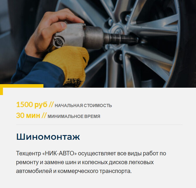 Фирма располагает коллективом профессиональных автотехников: у нас выполняют антикоррозийную обработку кузова, замену масла, заправку и починку кондиционеров, кузовной ремонт, покраску и полировку кузова, ремонт автостекол, АКПП, выхлопных систем, двигателей (в том числе дизельных), карбюраторов, подвески, электрооборудования и электронных систем управления автомобиля, сход-развал, тюнинг, установку автозвука и ксенона, шумоизоляцию салона, ремонт дисков, шиномонтаж. На услуги мастерской предоставляется гарантия, срок которой зависит от типа работ и используемых материалов.